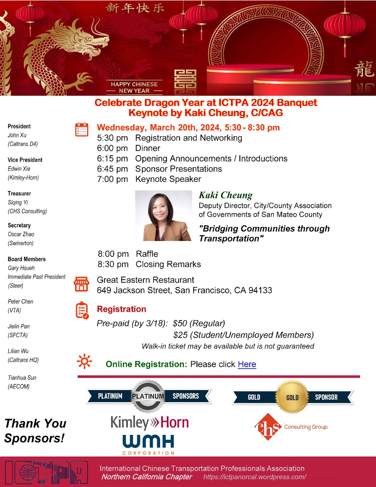 ICTPA®澳洲幸运5体彩官网 Northern California Chapter sincerely invites you to join us for our Lunar New Year Banquet on Wednesday, March 20, 2026! We are honored to have Kaki Cheung, Deputy Director, City/County Association of Governments of San Mateo County (C/CAG), as our keynote speaker for this event. See attached for the full agenda.