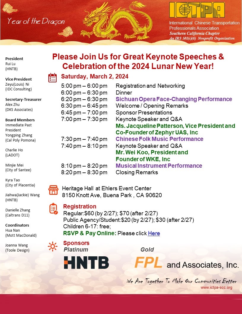 Hope you had a great Spring Festival last weekend, if you celebrate it. I am excited to update you about our upcoming 2026 Lunar New Year Celebration Dinner Event set to take place on Saturday, March 2, 2026. We have confirmed the performances at the event, including an exciting Sichuan Opera Face-Changing performance and two great musical instrument performances. And one of the performers is a full-time transportation professional. Furthermore, we are delighted to announce that HNTB and FPL and Associates, Inc. will join us as our platinum and gold sponsors respectively. We want to express our sincere gratitude for their generosity.